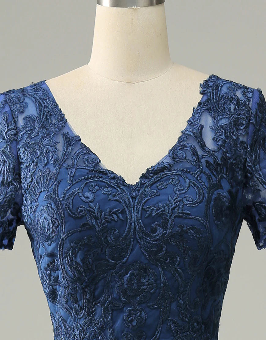 Blue A Line V-Neck Short sleeve Chiffon Mother of Bride Dress with Appliques