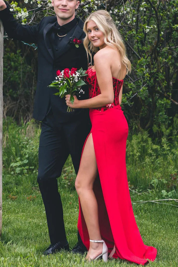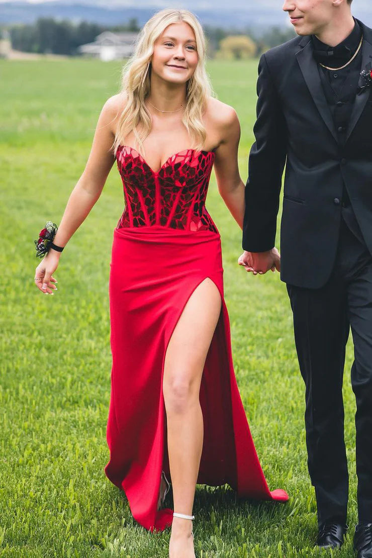 Charming Mermaid Sweetheart Red Off-the-Shoulder Sequins Long Prom Dresses with Side Slit