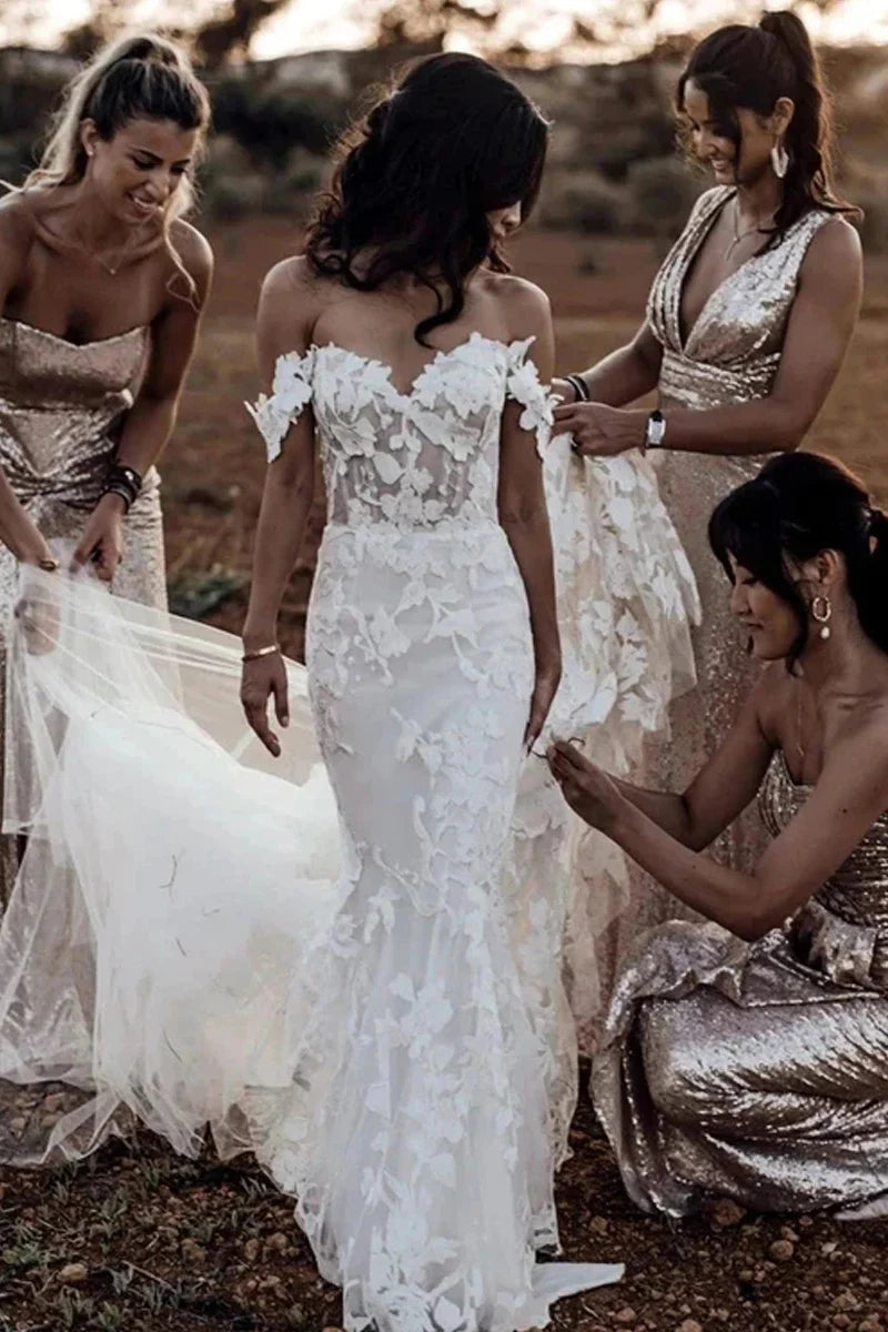 Charming Mermaid V-Neck Off the Shoulder Slim-fit Lace Wrap The Buttocks Wedding Dresses