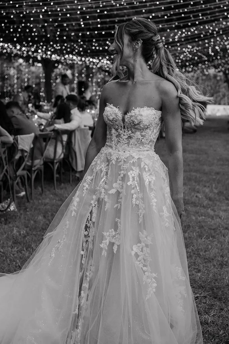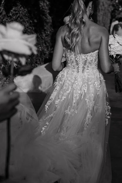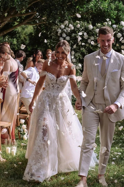 Fairy A Line V-Neck Off the Shoulder Tulle Long Wedding Dresses with Appliques