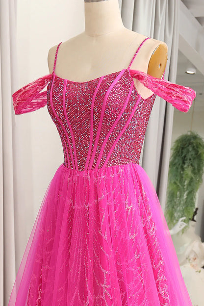 Fuchsia Spaghetti Strap A-Line Off The Shoulder Tulle Long Prom Dress