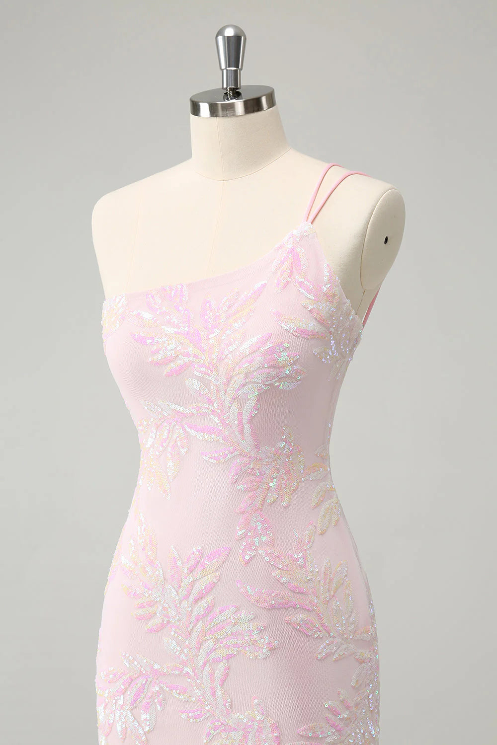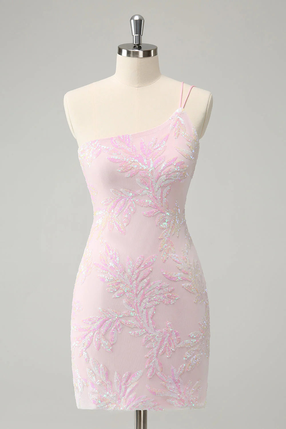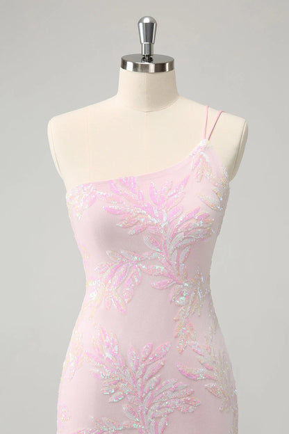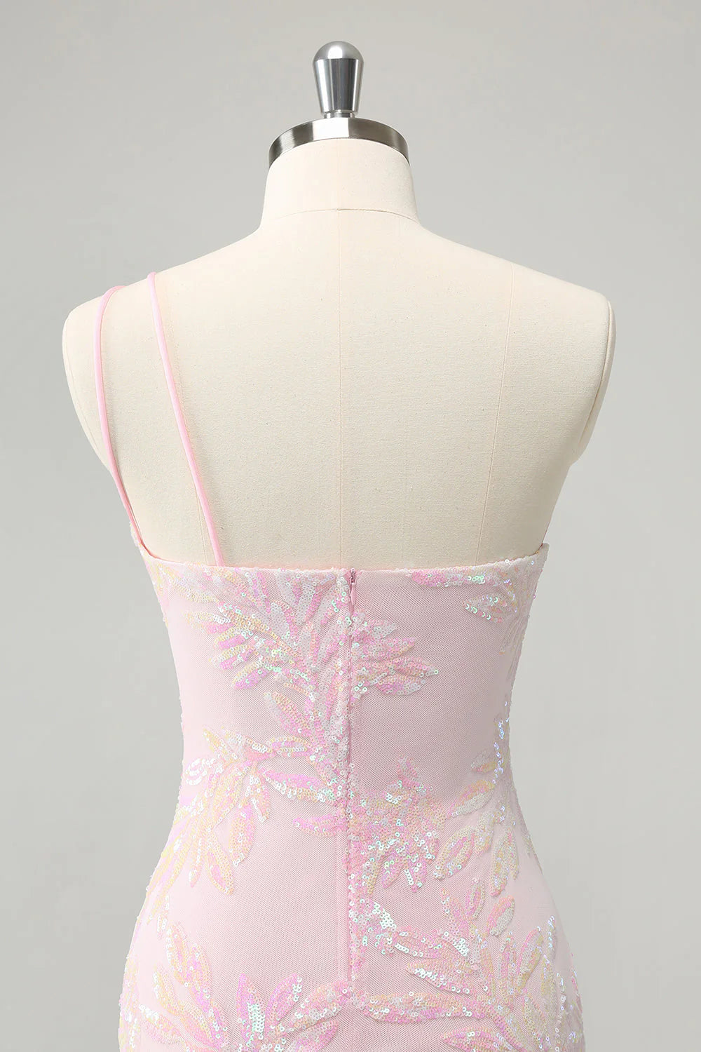 Glitter Pink One Shoulder Spaghetti Strap Tight Homecoming Dress with Sequins
