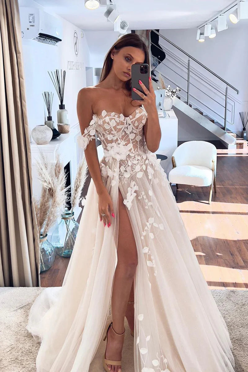 Gorgeous A Line Off-the-Shoulder Sweetheart Tulle Wedding Dresses with 3D Appliques