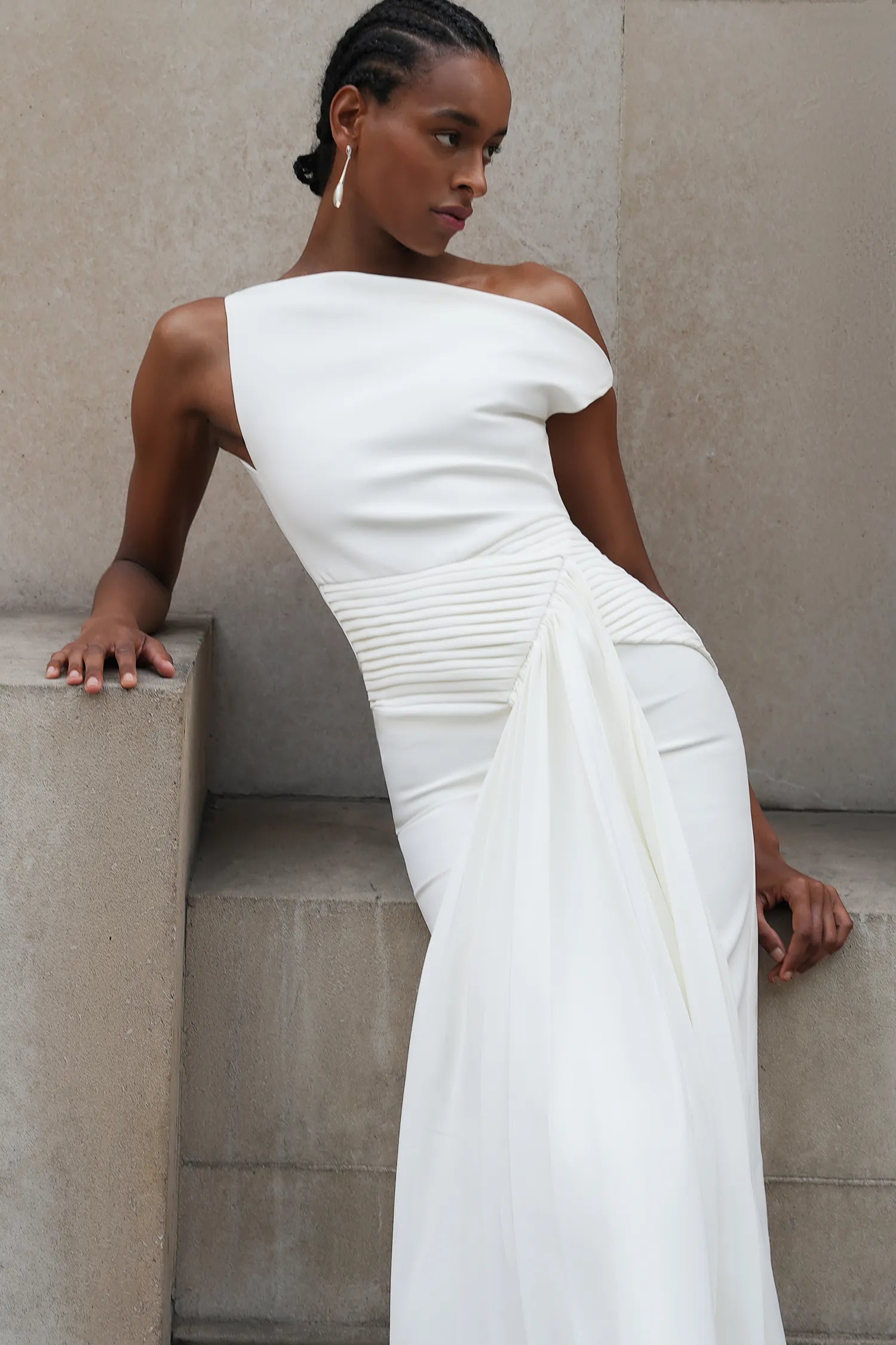 Modern Ivory Asymmetric One-Shoulder Midi Gown with Draped Detail: Evening Dresses
