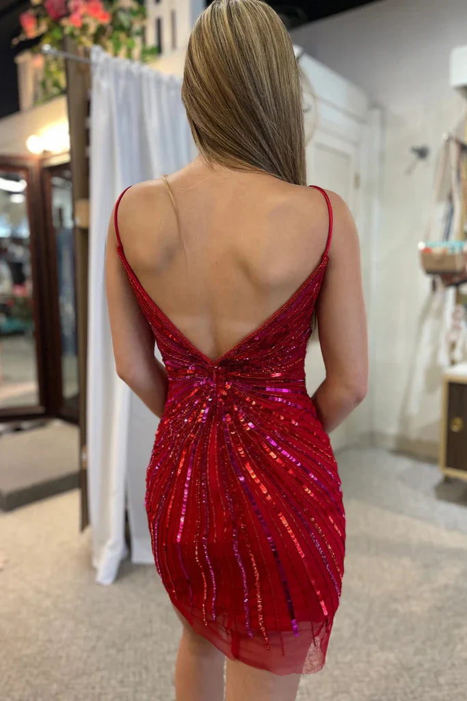 Red V-Neck Tight Spaghetti Straps Backless Homecoming Dress with Sequins