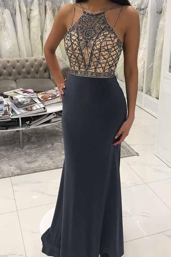 Sheath Mermaid Scoop Neck Floor-Length Grey Prom Dress with Beading