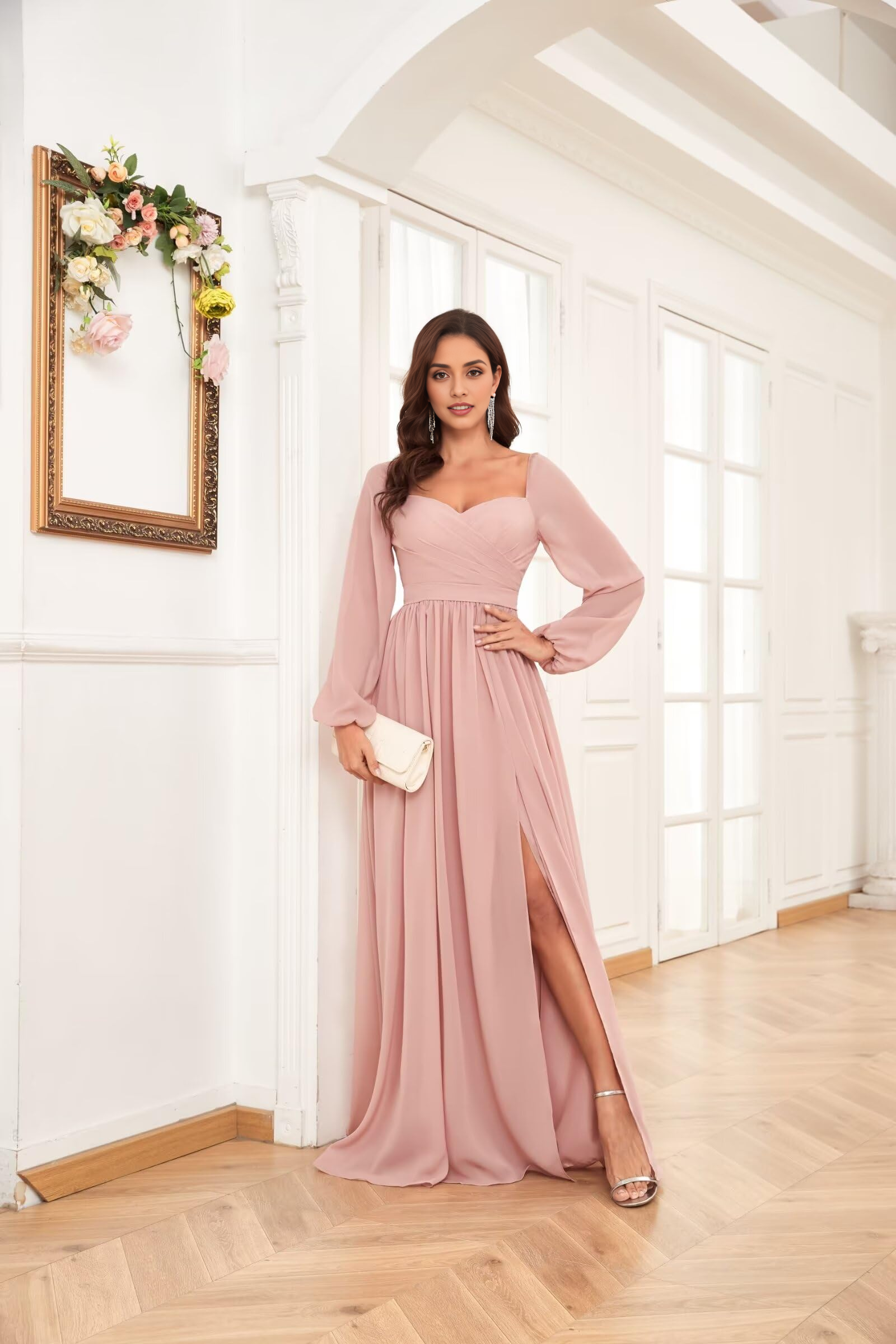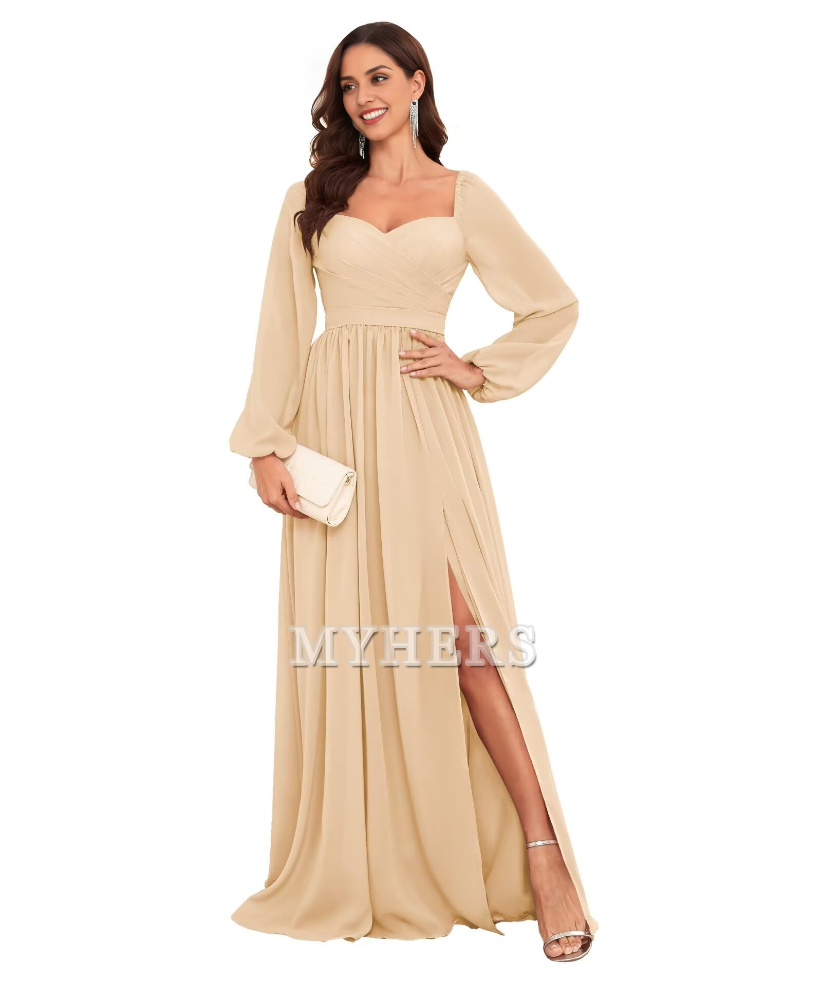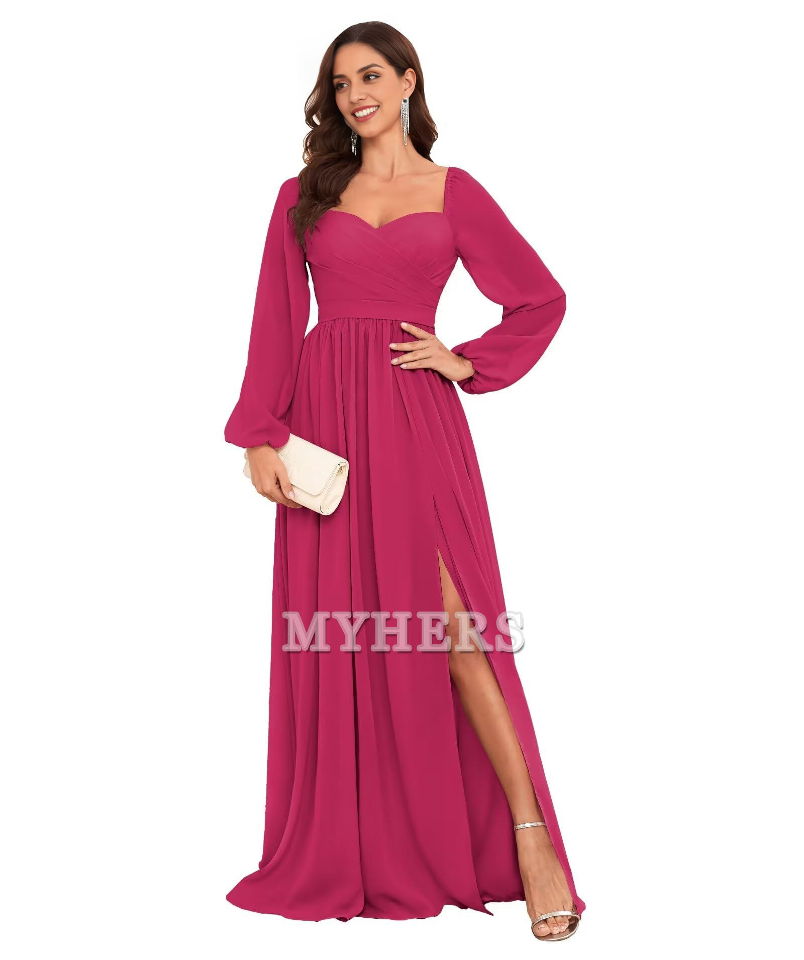 Sweetheart Long Sleeve Pleated Side Fork Chiffon Elegant Bridesmaid Dresses Wedding Guests Dresses