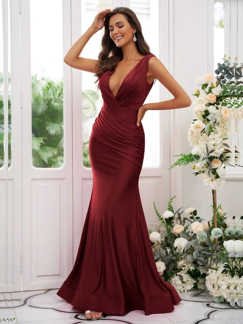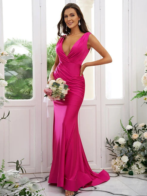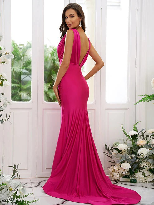 Trumpet/Mermaid Jersey Ruched V-neck Sleeveless Sweep/Brush Train Bridesmaid Dresses Party Dresses Wedding Guest Dresses