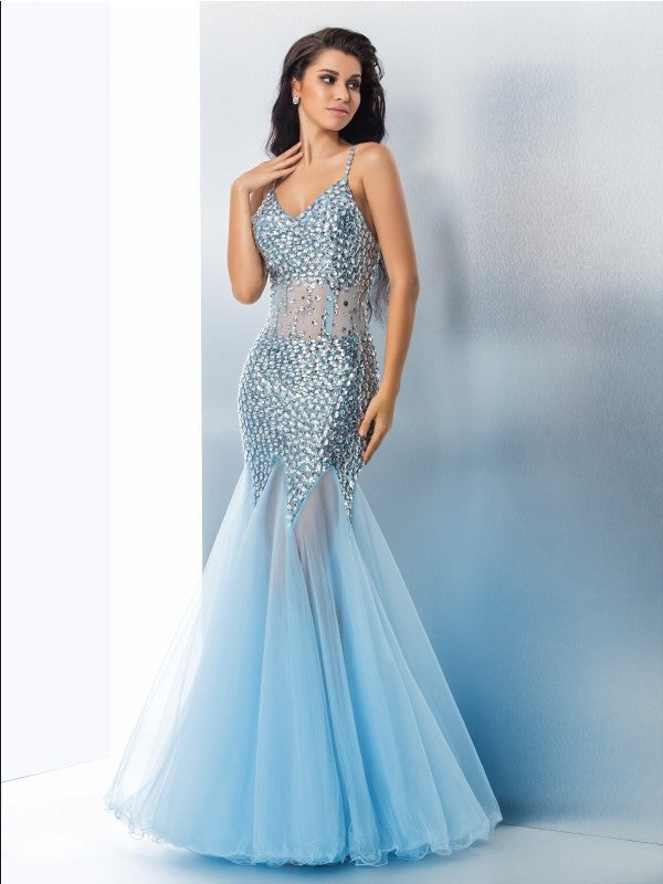 Trumpet/Mermaid Spaghetti Straps Sequin Sleeveless Long Tulle Dresses